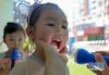 開(kāi)園第一天晨檢,一名小女孩張開(kāi)嘴露出一口潔白的牙齒。新華網(wǎng) 肖和勇 攝 -
