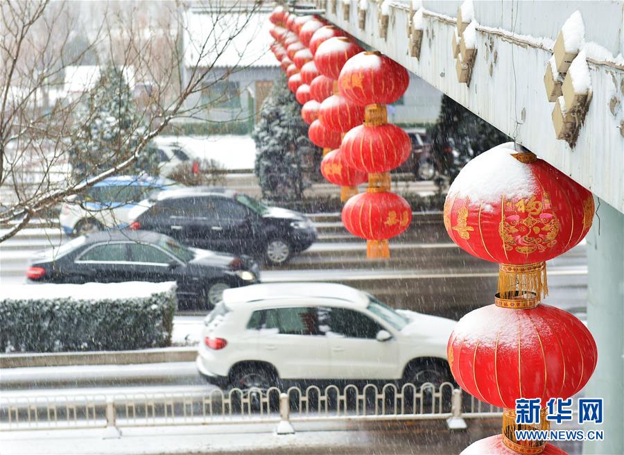 2月21日,大雪飄落在太原市濱河?xùn)|路路邊的燈籠上。當(dāng)日,山西省氣象局發(fā)布暴雪黃色預(yù)警,太原市區(qū)瑞雪普降。 新華社記者 曹陽 攝
