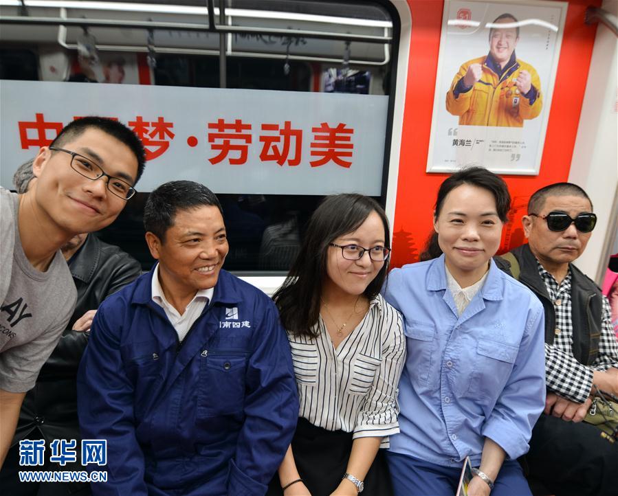 5月1日,全國勞模吳曉紅(右二)、劉志堂(左二)在“勞模地鐵專列”車廂內(nèi)與乘客合影。 “五一”勞動節(jié)期間,一列“勞模地鐵專列”亮相長沙地鐵1號線。該列車在車廂內(nèi)集中展示了由全國勞模、攝影家謝子龍拍攝的88位不同崗位全國勞模的肖像作品,旨在展示“勞動最光榮、勞動最崇高、勞動最偉大、勞動最美麗”的精神。新華社發(fā)(陳思維 攝) -