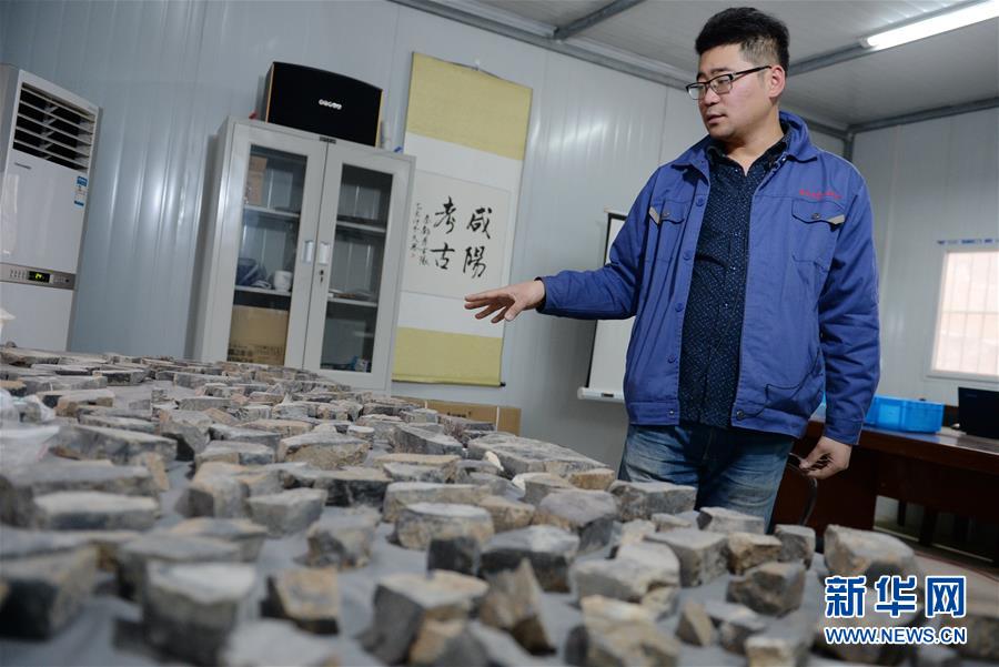 陜西考古研究院助理研究員張楊力錚介紹秦咸陽城胡家溝建筑遺址出土的石磬(1月24日攝)。近日,考古工作者首次在秦咸陽城遺址區(qū)域內(nèi)發(fā)現(xiàn)秦代大型國家府庫遺存。這是繼20世紀(jì)70至80年代發(fā)掘秦咸陽宮遺址以來,在秦咸陽大遺址保護區(qū)內(nèi)再次發(fā)現(xiàn)秦代大型官署建筑遺址。此次發(fā)現(xiàn)的遺址位于陜西省西咸新區(qū)秦漢新城窯店鎮(zhèn),地處秦都咸陽城宮區(qū)以西的胡家溝塬地。遺址建筑四面為夯土垣墻,墻體厚度約3米,寬19.5米,總長110米。發(fā)掘過程中出土了數(shù)量眾多的石質(zhì)編磬殘塊,目前已在23件殘塊上發(fā)現(xiàn)了小篆“北宮樂府”等字樣,再次證實了秦代設(shè)樂府的史實。新華社記者 李一博 攝 -