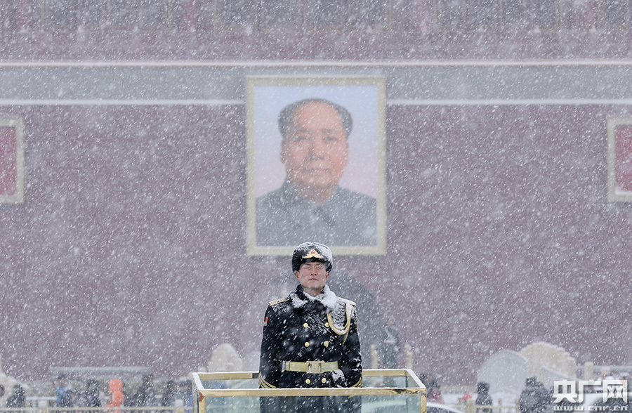 2月12日,北京降雪,天安門廣場(chǎng)上,正在雪中執(zhí)勤的哨兵。央廣網(wǎng)記者 韓靖 攝