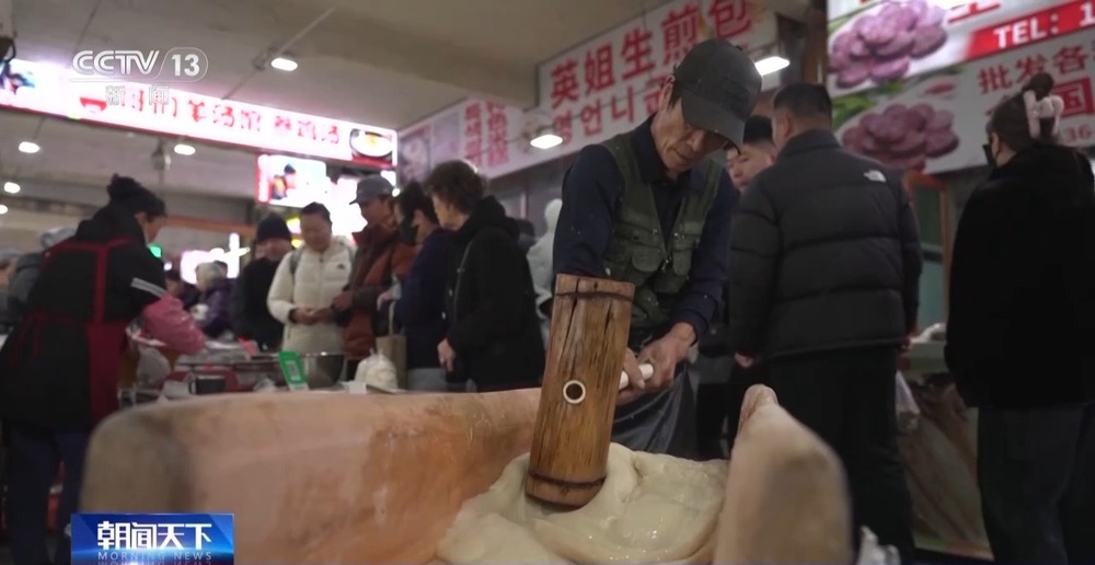 水上市場(chǎng)中間的打糕攤位也是人氣打卡點(diǎn)。光潤(rùn)潔白的江米團(tuán)在樺木槽中,一把用了近20年的木槌足足捶打30分鐘,再配上特制豆粉、蘇子、芝麻、白糖等調(diào)味,口感軟糯香甜。江米的多樣吃法在此盡顯,灌進(jìn)豬腸衣烹制后切片蘸辣醬,便是香氣四溢的米腸,這個(gè)攤位更是推出了多種口味,滿足不同需求。