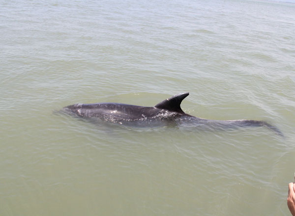 5月30日上午8時(shí)許,在海陵灣陽江港附近海灘游玩的群眾看到海灘上有一只受困的黑色海豚,迅速報(bào)警求助?吹胶k嗌眢w露在水外,可能有生命危險(xiǎn),群眾一起將海豚往水里推了十幾米,但海豚仍不能游回大海,只能在近海淺水里慢速游動(dòng)。