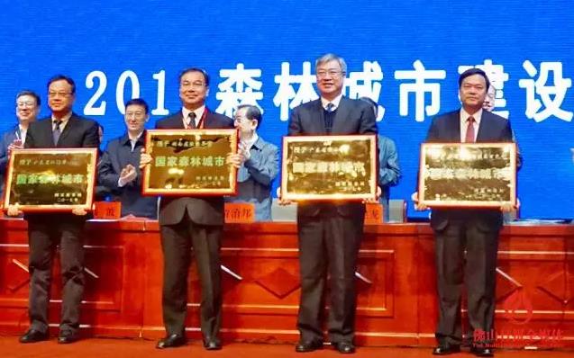 佛山市委書記魯毅(右二)、江門市長(zhǎng)劉毅(左一)接受“國(guó)家森林城市”授牌。