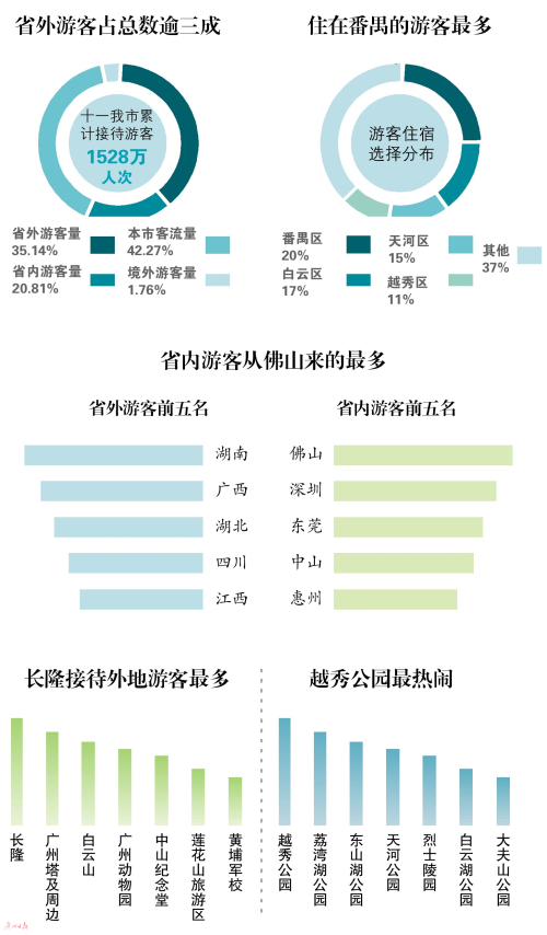 在剛剛過去的十一假期里,廣州創(chuàng)下史上最旺黃金周,全市國(guó)慶黃金周旅游接待總?cè)舜巍⒙糜螛I(yè)總收入均呈兩位數(shù)增長(zhǎng),均創(chuàng)歷史新高。那么,省外游客從哪里來廣州的最多?他們最喜歡住在哪里?哪個(gè)公園最旺?廣州市旅游局發(fā)布大數(shù)據(jù)統(tǒng)計(jì),看看數(shù)據(jù)背后你所不知道的實(shí)情。