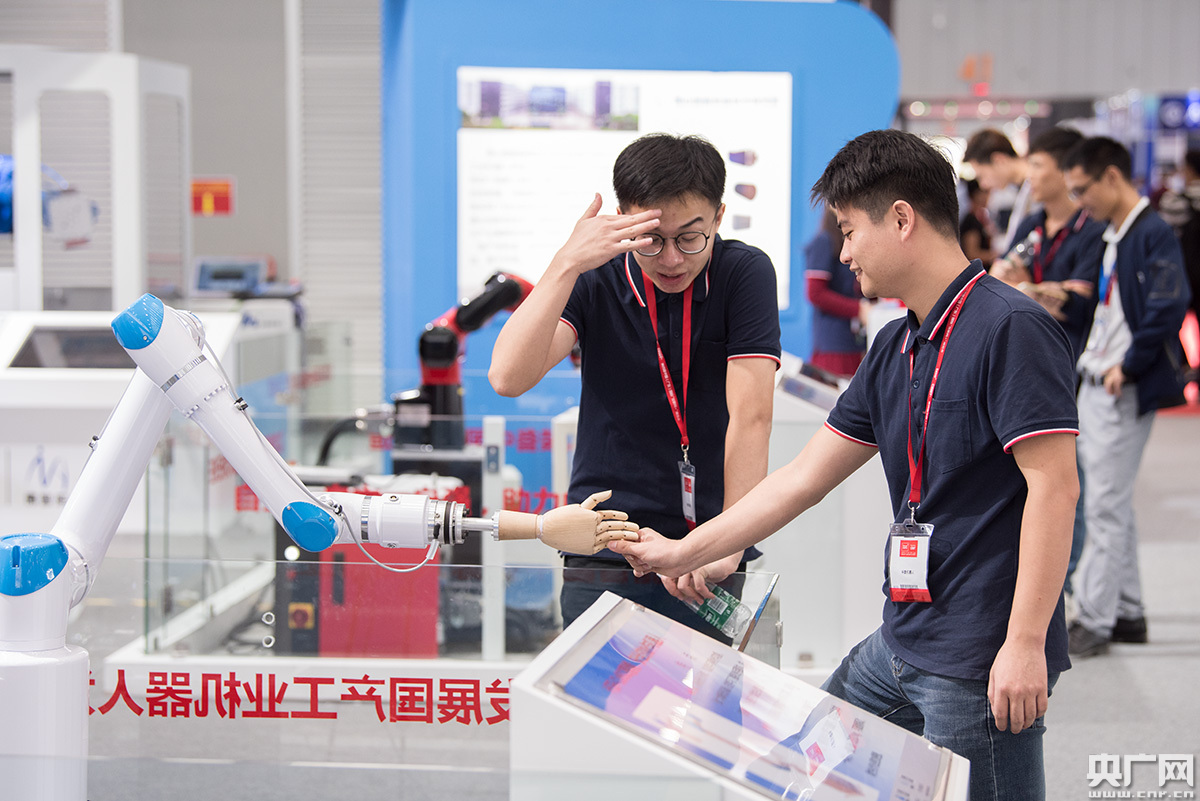 展館內(nèi)展示的可以與人握手的“機(jī)器人”。(央廣網(wǎng)記者 官文清 攝)