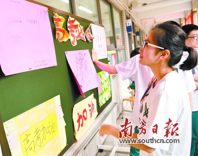 省實(shí)附中的學(xué)生站在貼滿(mǎn)祝福語(yǔ)的展板前。南方日?qǐng)?bào)記者 王輝攝