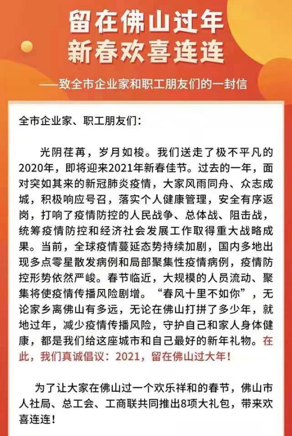 12日,佛山市多部門聯(lián)合推出8項(xiàng)禮包,號召廣大職工盡量留在佛山度過一個(gè)歡樂祥和的春節(jié)。