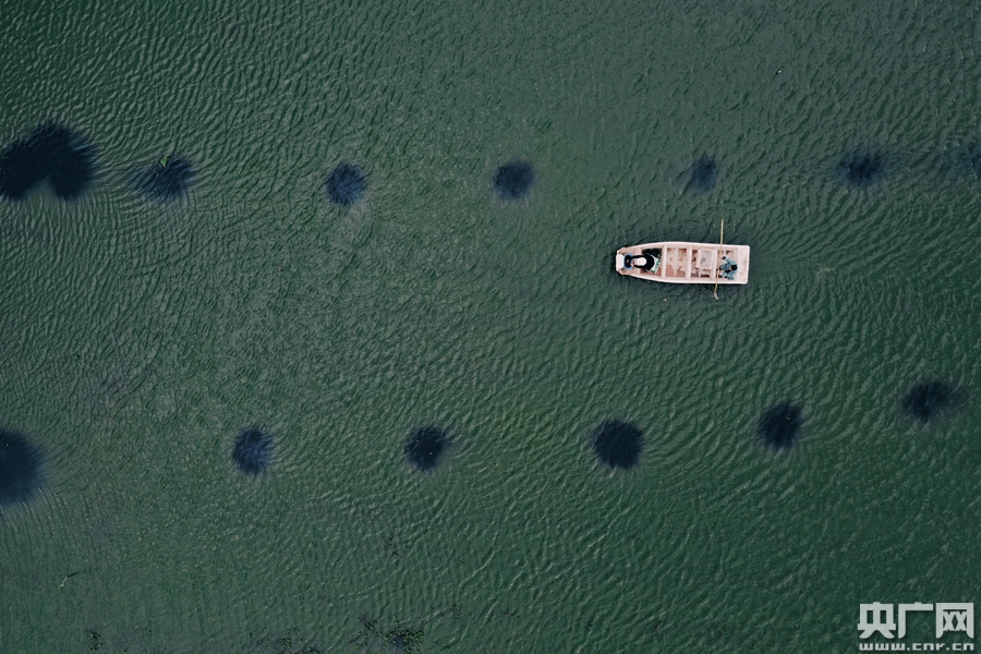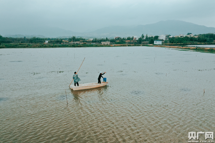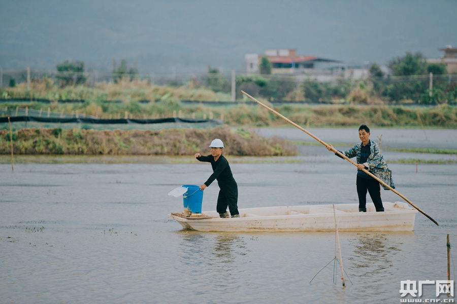 養(yǎng)殖戶乘坐小船駛過(guò)稻蝦田。(央廣網(wǎng)記者 官文清攝)