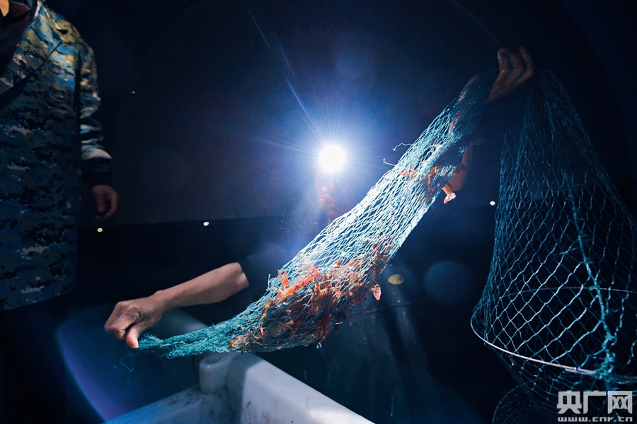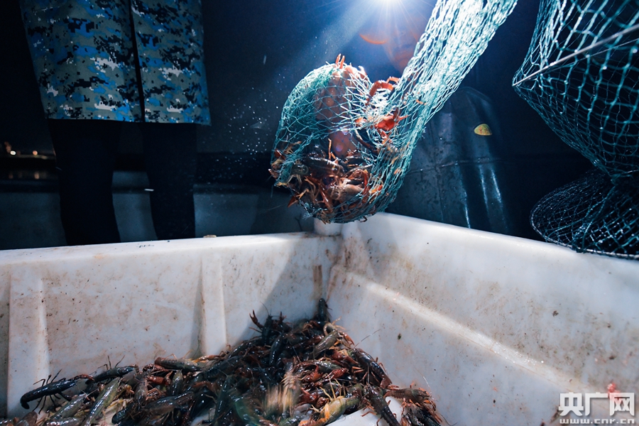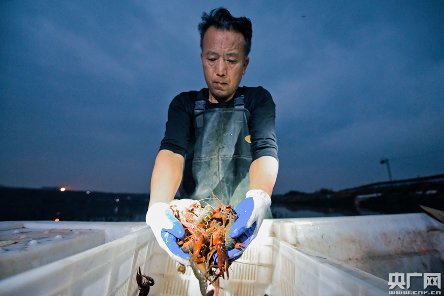 為了能讓小龍蝦盡早端上消費(fèi)者的餐桌,養(yǎng)殖戶需要在凌晨將小龍蝦捕撈上岸。(央廣網(wǎng)記者 官文清攝)