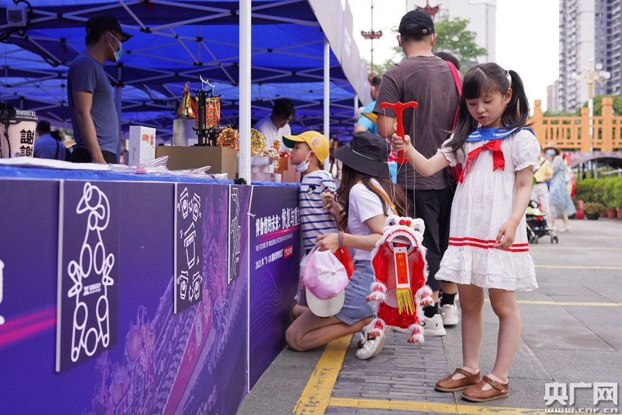 小朋友在玩耍非遺文創(chuàng)產(chǎn)品。(央廣網(wǎng)記者 官文清攝)