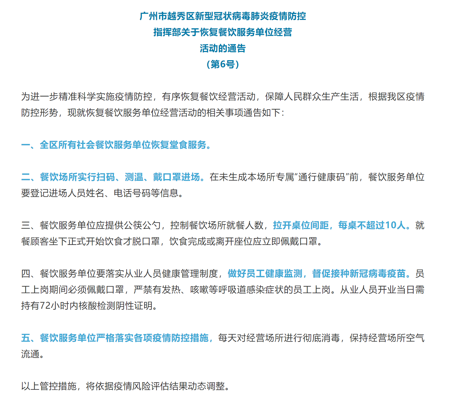 一、全區(qū)所有社會(huì)餐飲單位(含提供堂食的食品銷售單位)恢復(fù)堂食服務(wù)。