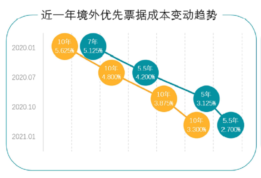 報(bào)告期末,碧桂園的平均融資成本為5.56%,較2019年底下降78個(gè)基點(diǎn)。2021年1月發(fā)行的5億美元5.5年期票據(jù)和7億美元10年期票據(jù)的利率更是分別為2.7%、3.3%,創(chuàng)民營房企發(fā)債融資成本之新低。在行業(yè)整體融資趨緊的背景下,碧桂園以超低成本發(fā)債融資,充分顯示集團(tuán)穩(wěn)健的財(cái)務(wù)盤面在資本市場上擁有的競爭實(shí)力。