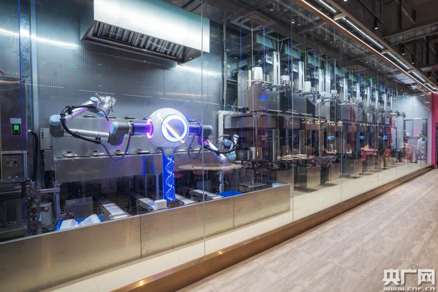 千璽機器人餐廳雙臂煲仔飯機器人、炒鍋機器人陣列。(央廣網(wǎng)發(fā))