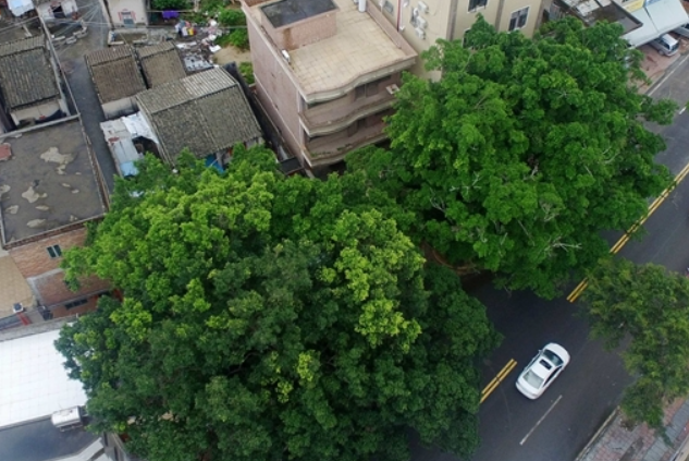 在佛園村佛嶺村民小組的老村莊入口,兩棵參天古榕樹一左一右分立路邊,枝繁葉茂,形似一道拱門,為往來村民遮陰避陽,也如同衛(wèi)兵守護著村莊。這兩棵古榕樹均為細(xì)葉榕,右邊的較大的榕樹已有500多年樹齡,左邊的有200多年樹齡。