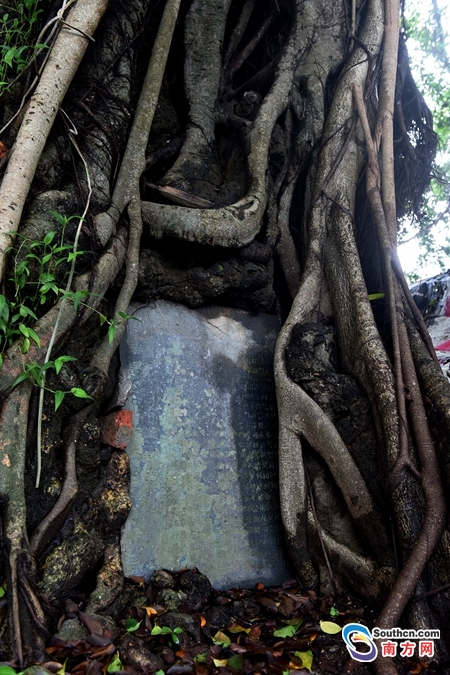 南方網(wǎng)訊 前往惠州惠東縣平海圩鎮(zhèn),經(jīng)過佛園村村口時,會看到兩棵枝葉茂密的大榕樹。更為稀奇的是,其中一棵有著500年樹齡的大榕樹根部“長”著一塊古石碑,究竟是怎么回事?石碑上寫著啥?
