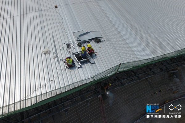 為準備體育場屋面吊頂施工,吊裝工人正在安裝吊頂構件。新華網(wǎng) 伍嘉煒攝