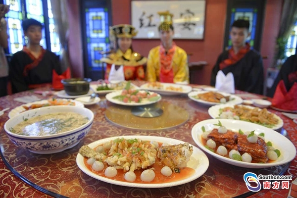 當(dāng)然紅云宴為何重現(xiàn)傳統(tǒng)的場景也并不只有菜肴。上午9時30分,“六月六,紅云宴”開始,一群身穿南漢服裝的大臣和侍女等候在宴會廳外迎接貴賓。賓客入場后,施禮官介紹本次紅云宴活動,為活動正式開場。