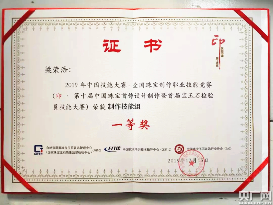梁榮浩在2019全國珠寶制作職業(yè)技能競賽中獲職工組一等獎。(央廣網(wǎng)發(fā) 受訪者供圖)