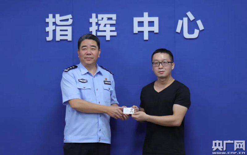 蒙志勇從佛山公安民警的手中接過自己的身份證。(央廣網(wǎng)發(fā) 佛山公安供圖)