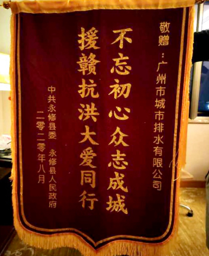 中共永修縣委、永修縣人民政府也給廣州水投集團(tuán)廣州排水公司贈送了“不忘初心眾志成城 援贛抗洪大愛同行”的錦旗。
