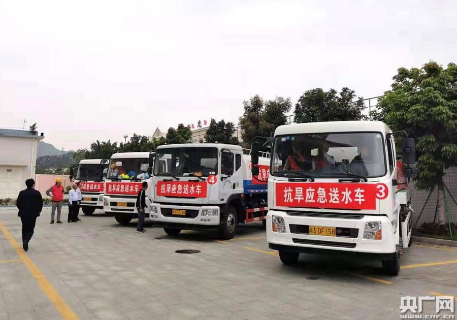 廣州水投廣州自來水公司4臺大型送水車趕赴海豐縣。(央廣網(wǎng)發(fā))
