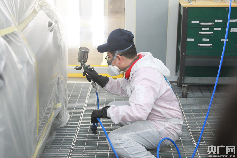 當(dāng)?shù)弥袡C(jī)會到工廠現(xiàn)場噴漆后,他特意帶上了參賽時的工裝和工具。盡管在一線實(shí)操,與之前在教學(xué)場景有很大差異,但從調(diào)色到噴涂,王濤扎實(shí)的基本功還是贏得了老師傅們的一致肯定。