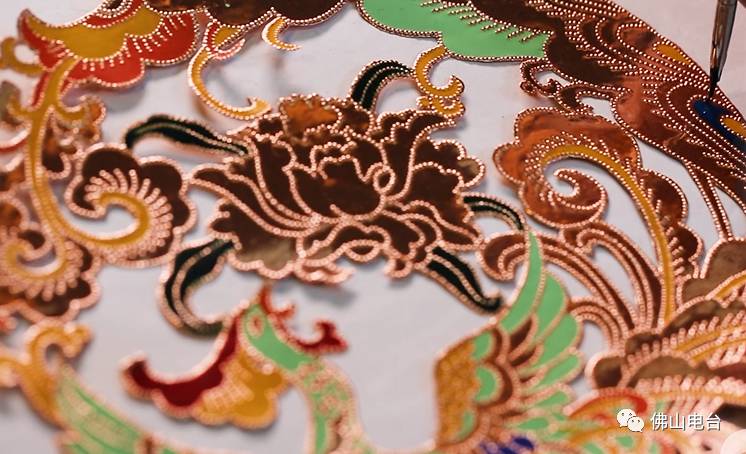 銅鑿剪紙,是佛山剪紙中最具特色的一個品種,由于有金屬銅的光澤,銅鑿剪紙呈現(xiàn)出色彩強烈、珠光閃閃、金碧輝煌的效果。