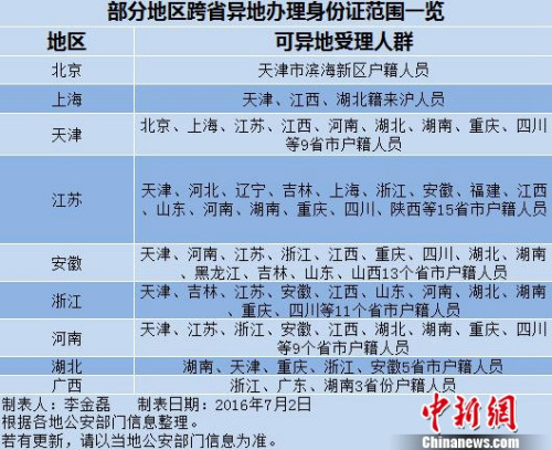 如,北京自7月1日起試點為在西城區(qū)暫住登記居住半年以上的天津市濱海新區(qū)戶籍人員,提供異地換領、補領居民身份證服務;上海則明確,持有《上海市居住證》且在有效期內(nèi)的天津、江西、湖北籍來滬人員,可在本市換領、補領居民身份證,其他省市來滬人員異地受理辦證工作將分步實施。