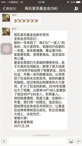 楊振海告訴記者:“剛開(kāi)始的時(shí)候,這個(gè)群里的人比較少,就我的五個(gè)兒子,然后加上孫子輩的家庭,后來(lái)家庭成員們都知道了,就發(fā)展到三房兄弟,微信群就壯大了,基金會(huì)也初具規(guī)模,現(xiàn)在還有專(zhuān)人負(fù)責(zé),長(zhǎng)孫楊勇是基金會(huì)會(huì)長(zhǎng),學(xué)財(cái)務(wù)的孫女楊娟負(fù)責(zé)管財(cái)務(wù),當(dāng)小學(xué)教師的孫女負(fù)責(zé)群里的日常慈善宣傳!
