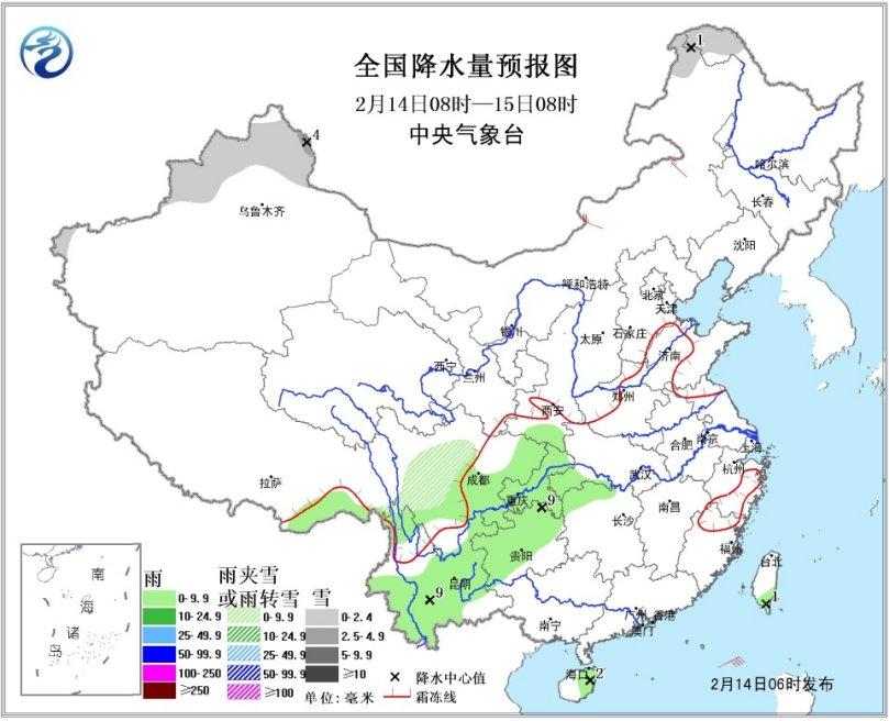 14日08時至15日08時,北疆北部、川西高原中部等地有小雪或雨夾雪,局地中雪;西南地區(qū)東部和南部、西藏東南部、海南東部等地有小雨或陣雨。內蒙古中東部有4-5級風。(圖1)。