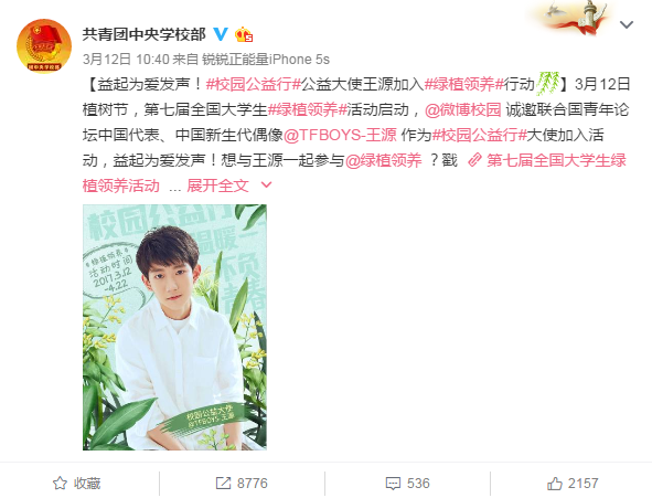 今年,王源、許魏洲、楊千嬅等眾多明星成為本屆活動的校園公益大使。明星大使通過短視頻號召大家加入到綠植領(lǐng)養(yǎng)活動,在校園中踐行公益,截止目前王源、楊千嬅、包貝爾、劉璇的四條短視頻播放量近1000萬次。在線上活動啟動當(dāng)天,@TFBOYS-王源 3月12日發(fā)布自己擔(dān)任校園公益行公益大使的微博,該條微博互動量超過642萬,轉(zhuǎn)發(fā)量突破607萬。明星名人在公益推廣上發(fā)揮著巨大的作用,據(jù)微博數(shù)據(jù)顯示2016年微博明星名人發(fā)布的公益話題閱讀量超過300億次,本次校園公益行邀請王源、許魏洲等在學(xué)生群體中有眾多粉絲和巨大影響力的明星作為公益大使,充分調(diào)動了學(xué)生群體參與公益的積極性,讓大家自發(fā)參與到公益活動中。