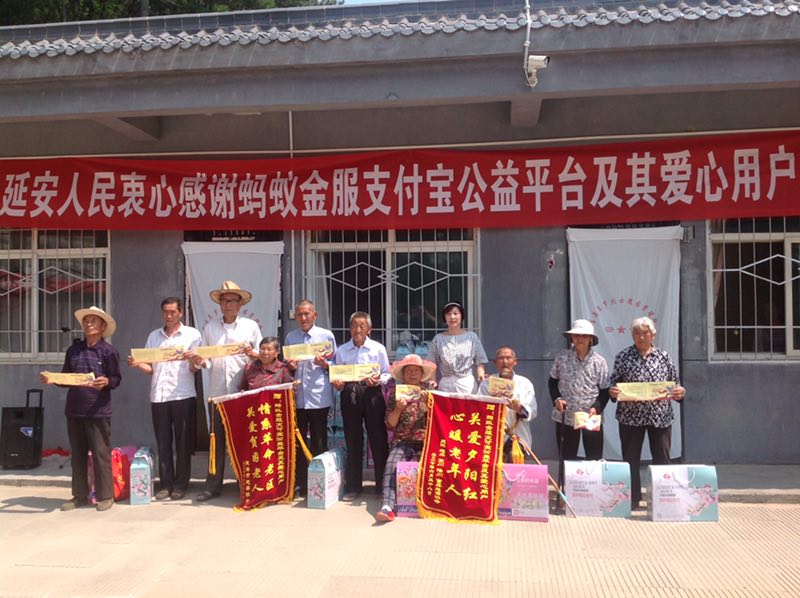 為幫助老區(qū)人民精準(zhǔn)扶貧脫貧,2017年6月29日,中國老齡事業(yè)發(fā)展基金會與螞蟻金服支付寶公益平臺在陜西省延安市富縣舉辦“孤老救助大行動”公益項(xiàng)目捐贈活動,為延安市富縣、志丹、洛川、延川等貧困縣區(qū)1.5萬名孤老及貧困老人捐贈意外傷害救助公益保險,醫(yī)療救助保障總金額達(dá)4.5億元,充分體現(xiàn)螞蟻金服支付寶公益平臺情系革命老區(qū)、關(guān)愛貧困老人的高尚情懷,樹立了螞蟻金服支付寶愛老助老的公益品牌形象;顒悠陂g,中國老基會代表螞蟻金服支付愛心用戶走訪慰問了部分老紅軍戰(zhàn)士、孤老以及貧困老人,為他們捎去社會各界愛心人士的真情關(guān)愛與美好祝福,祝老人們健康長壽,幸福平安快樂安度晚年。