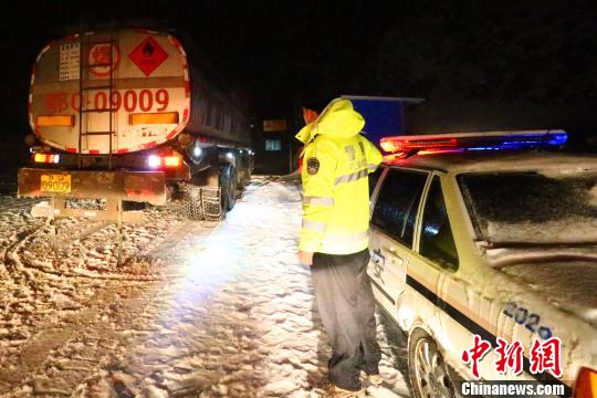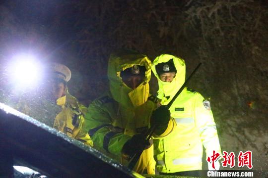 交警在積雪結(jié)冰道路險(xiǎn)段巡邏值守 榮滔 攝