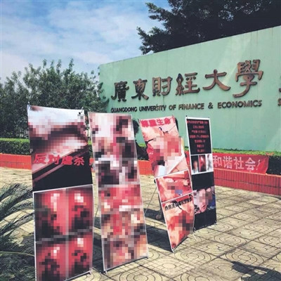 該事件昨日再起波瀾。昨日中午,有動(dòng)物保護(hù)志愿者持易拉寶、橫幅等材料前往廣東財(cái)經(jīng)大學(xué)三水校區(qū)門前進(jìn)行宣傳。據(jù)多位目擊者稱,校方安保人員與志愿者發(fā)生沖突。