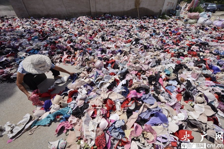 2014年8月6日,成壽寺地鐵站附近少角村,回收站工作人員在整理胸罩。近日,該回收站陸續(xù)回收了大量胸罩并當街晾曬,引起路人好奇。圖片作者:新京報王嘉寧/CFP