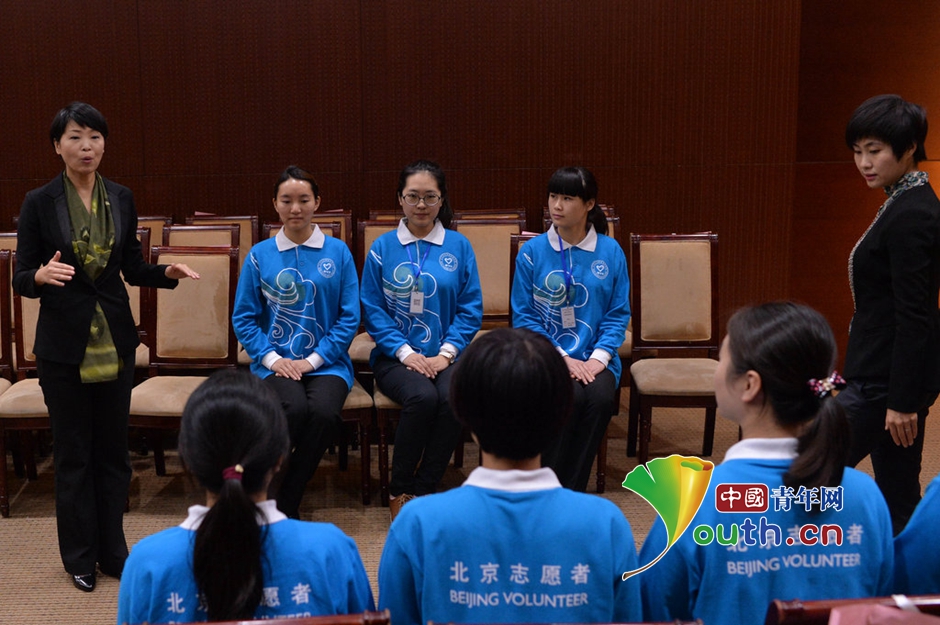 2014年10月24日,北京,志愿者在進行形體和禮儀的相關培訓。圖片作者:京華時報 王苡萱/CFP
