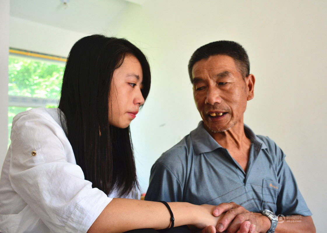 2016年8月2日,安徽省岳西縣毛尖山鄉(xiāng),今年剛剛高中畢業(yè)的劉園園,被合肥一所大學(xué)錄取。劉園園是一名棄嬰,18年前,被毛尖山鄉(xiāng)紅旗村五保戶的劉和帥收養(yǎng)。如今,父親年過花甲、體弱多病,已無力供圓圓讀書。她這個暑假要到當(dāng)?shù)氐囊患一疱伒甏蚬,賺取學(xué)費(fèi)。圖為臨行前圓圓跟父親道別。吳均奇/東方IC