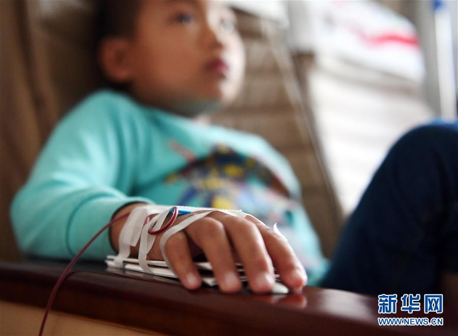 在廣西南寧市第六人民醫(yī)院,一名地貧患兒在接受輸血治療(4月27日攝)。