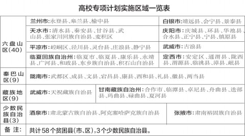2016年實施高校專項計劃的院校由教育部直屬高校和其他自主招生試點高校承擔。甘肅省實施高校專項計劃的區(qū)域為轄區(qū)11個市(州)的58個集中連片貧困縣(市、區(qū))及甘肅省酒泉市肅北蒙古族自治縣、酒泉市阿克塞哈薩克族自治縣、張掖市肅南裕固族自治縣等3個少數(shù)民族自治縣。