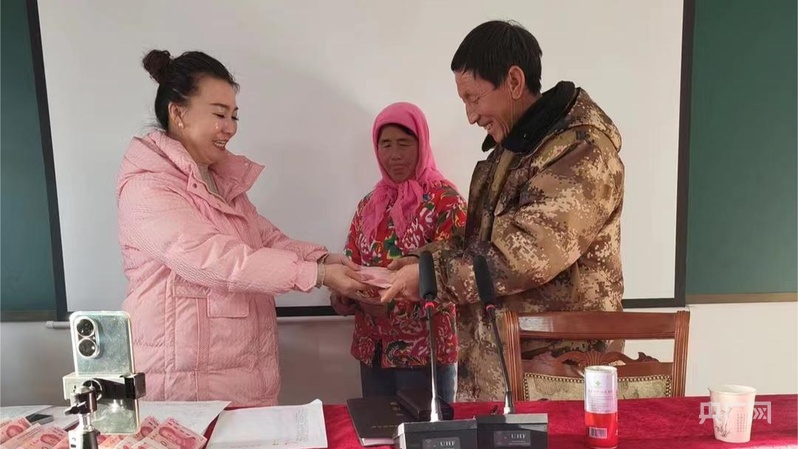楊清艷給村民分紅(央廣網(wǎng)發(fā) 李文 攝)