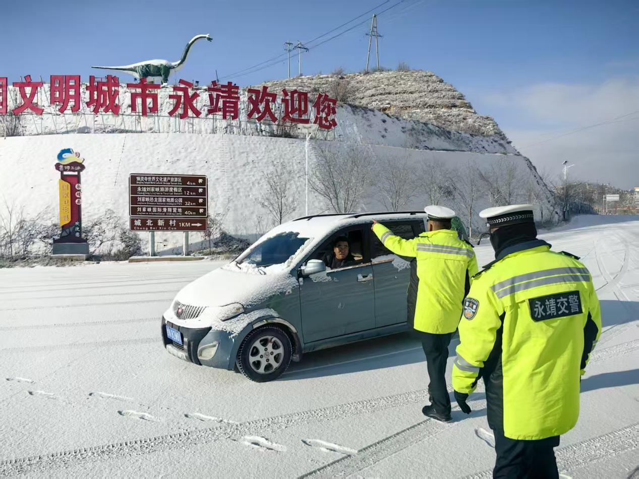 11月24日,受寒潮天氣影響,甘肅省永靖縣出現(xiàn)降雪,積雪深度2~7厘米,給群眾出行帶來不便,為做好道路交通安全工作,交管大隊(duì)、各派出所啟動(dòng)雪天道路交通管理應(yīng)急預(yù)案,加強(qiáng)路面巡查宣防工作,全力以赴清路障、排隱患、保暢通,督促、協(xié)助駕駛員做好防滑措施,并為受困車輛提供救助服務(wù)。