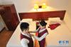 2月1日,在南航?诿捞m基地,梁鶴(右)在出發(fā)前為丈夫?qū)幦逭碇b。新華社發(fā)(楚洪雨 攝) 春運首日,南航90后夫妻乘務(wù)員寧儒和梁鶴共同執(zhí)行從?谥凉枮I的航班任務(wù),一同在崗位上開始了春運的忙碌。小兩口于2015年入職南航,工作后相識相戀,于2017年結(jié)婚。 -