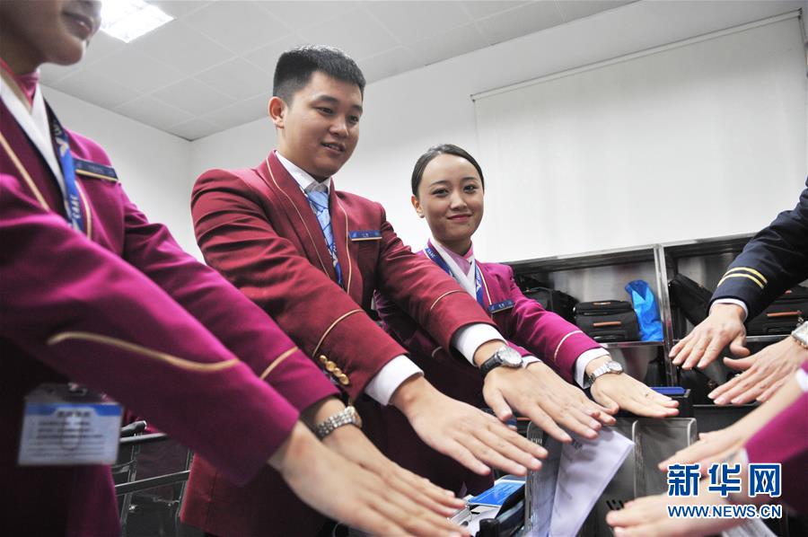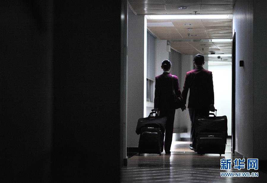 2月1日,在南航?诿捞m基地,寧儒(右)和梁鶴手牽手一起執(zhí)行航班任務(wù)。新華社發(fā)(楚洪雨 攝) -