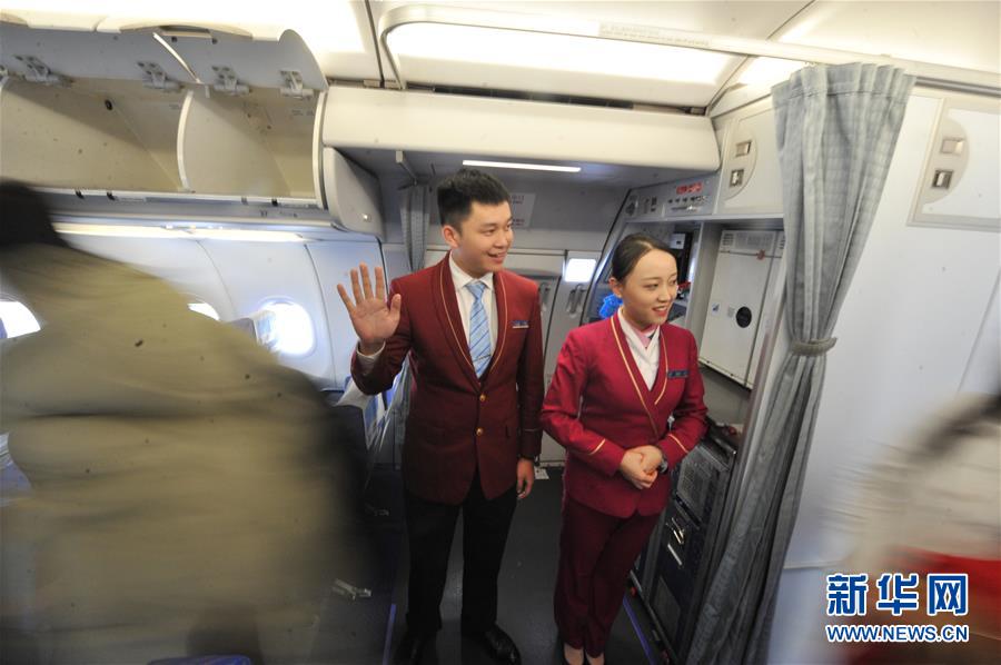 2月1日,寧儒和梁鶴在航班上為乘客服務(wù)。新華社發(fā)(楚洪雨 攝) -