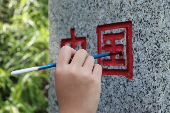 板爛邊境派出所民警正一點一點的給界碑描紅,每一筆都是那么鏗鏘有力,一塊塊界碑上閃爍著耀眼光芒,就像堅守在祖國邊疆的戰(zhàn)士,巍巍佇立在祖國邊境第一線。
