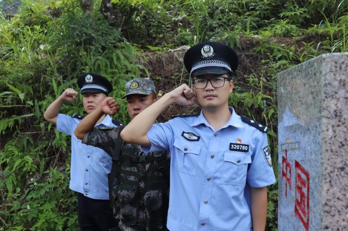 在莊嚴(yán)的界碑前,板爛邊境派出所民警們目光堅定、果決向界碑宣誓。
