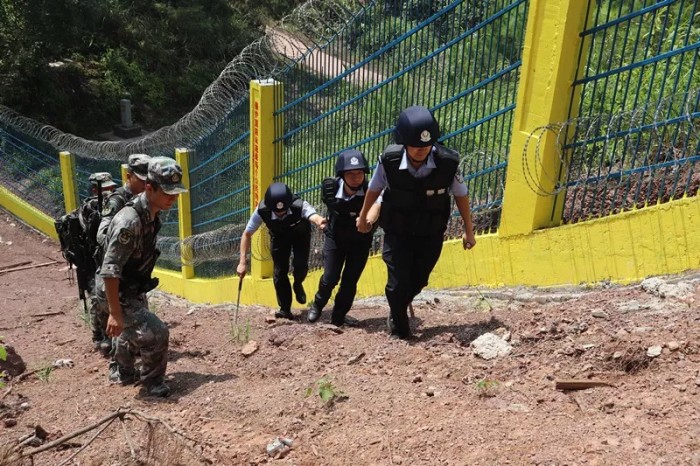板爛邊境派出所民警與駐地解放軍聯(lián)合開展邊境踏查。