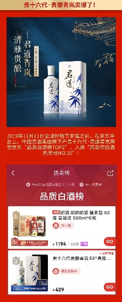 當(dāng)閃耀國際舞臺的中國貴酒集團(tuán)及旗下品牌貴十六代與京東2019年雙11全球好物節(jié)相遇,所產(chǎn)生的超級戰(zhàn)績無疑成為了今年中國白酒界標(biāo)志性事件。