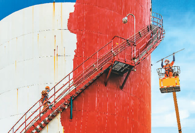 4月22日,中國石化安慶分公司工人為生產(chǎn)設(shè)備刷新漆。程周平攝(人民視覺)